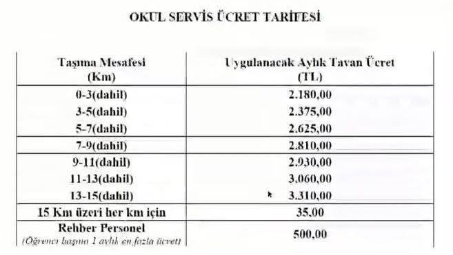 15 kilometreyi aşan mesafeler için her kilometre başına 35 TL ek ücret alınacak. Ayrıca, rehber personel için öğrenci başına aylık en fazla 500 TL ücret yansıtılacak.