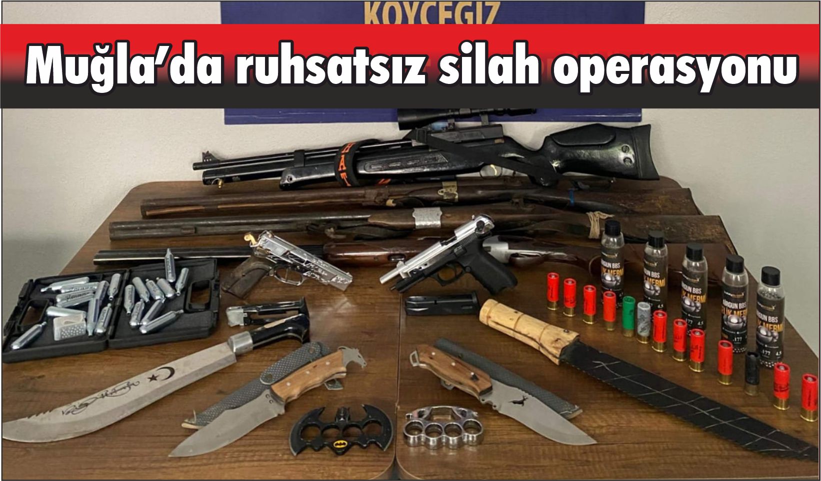 Muğla’nın Köyceğiz ilçesinde İlçe Emniyet Müdürlüğü ekipleri, bir şahsın iletişim uygulaması üzerinden silah satışı yaptığı bilgisine ulaştı. Bunun üzerine harekete geçen ekipler, şüpheli şahsın ikametinde arama yaptı. Yapılan aramada, 3 adet belgesiz av tüfeği, belgesiz havalı tüfek, belgesiz kurusıkı tabanca ve şarjörü, saçma atan havalı tabanca ve şarjörü, testere ağızlı pala, oluklu pala, 2 adet oluklu kasatura, 2 adet muşta, 13 adet tüfek kartuşu, 19 adet gaz tüpü ve saçma ele geçirdi. Şüpheli şahıs Uşak ilinde yakalandı. /İHA