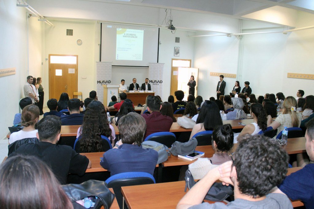 İktisadi ve İdari Bilimler Fakültesi Dekanı Prof. Dr. Hatice Hicret Özkoç, fakülte öğretim üyeleri ve öğrencilerinin katıldığı ‘Kariyer Günleri’ programında MÜSİAD Muğla Şube Başkanı Nevzat Aykaç, Başkan Yardımcıları Yunus Manav ve Mehmet Ali Kalay iş hayatında yaşadıkları tecrübeleri öğrencilere aktardı. Öğrencilerin mezun olduktan sonra gelecek ile ilgili planlamalarının nasıl olması gerektiği ve yaşadıkları tecrübeleri aktaran MÜSİAD Başkan ve Yardımcılarının katıldığı programa öğrenciler tarafından yoğun ilgi gösterildi.(İHA)