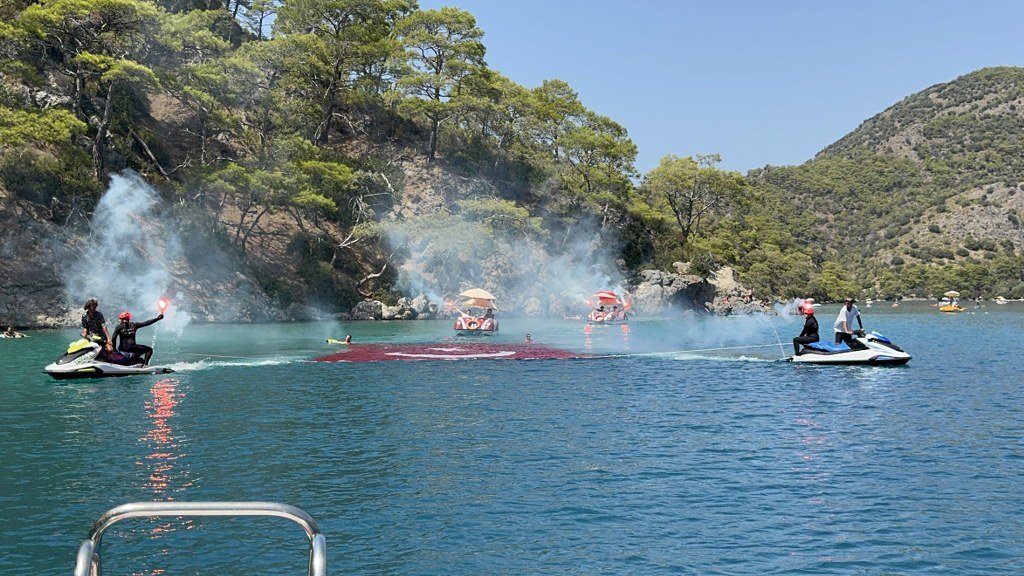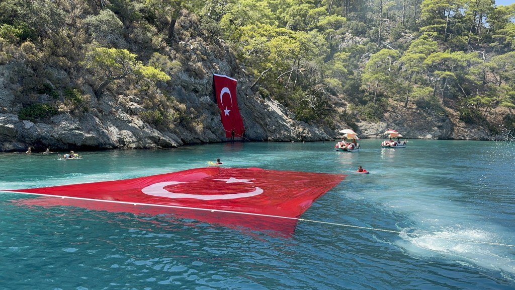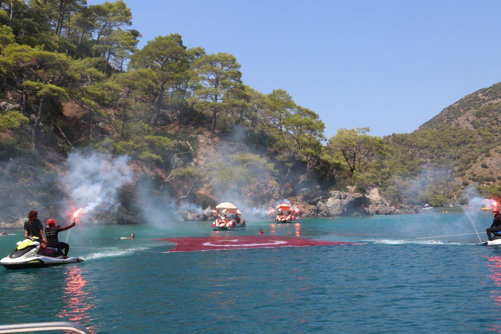Fethiye'nin Ölüdeniz Mahallesi'nde bulunan Beach Of Lagoon'da, 30 Ağustos Zafer Bayramı, büyük bir coşkuyla kutlandı. Kutlamalarda, kahramanlık türkülerine denizdeki ve plajdaki tatilciler de eşlik etti.