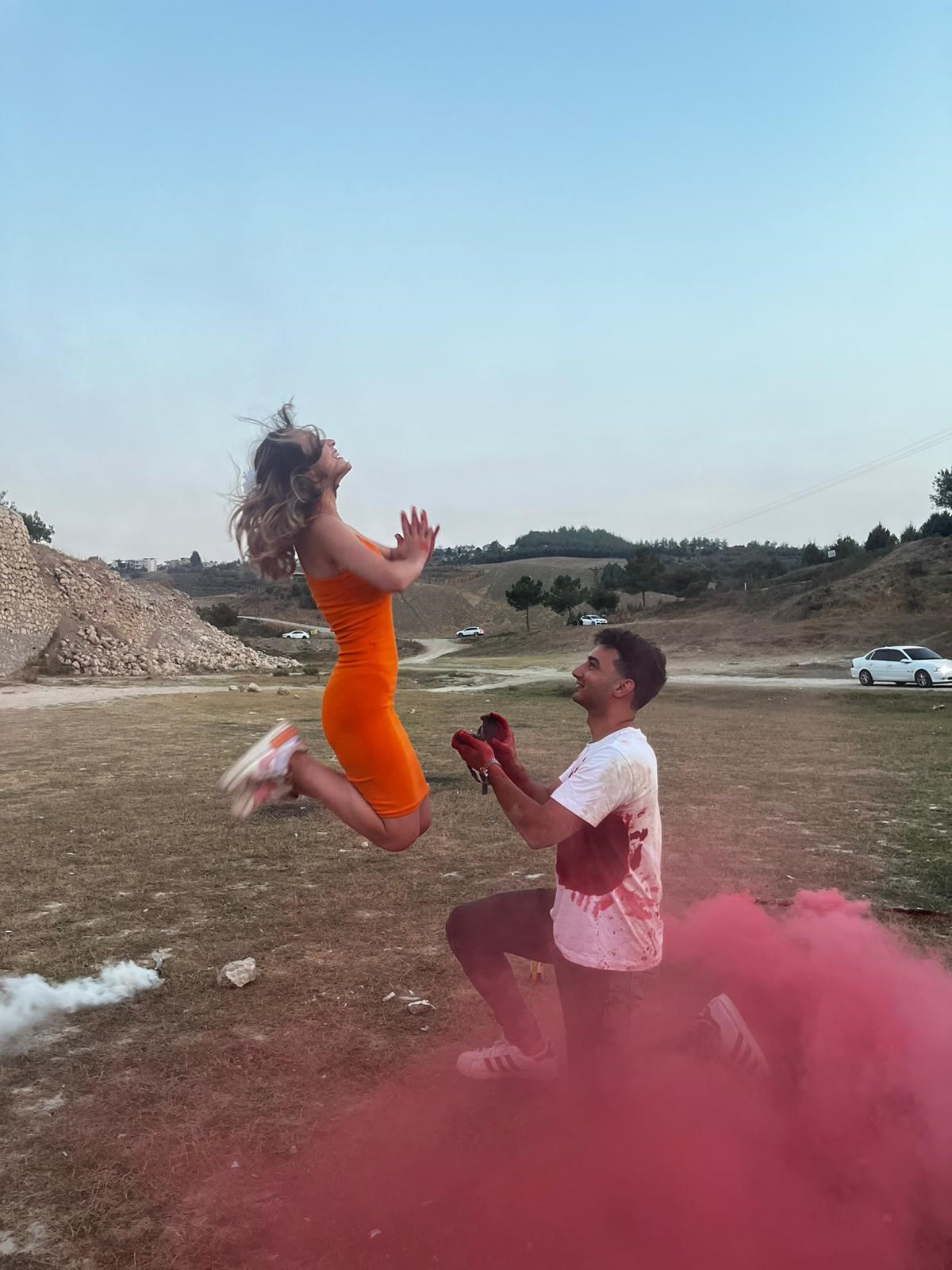 29 yaşındaki Şakir Karakaya, 26 yaşındaki sevgilisi Nazlı Gümüş'e evlilik teklifi etmek için iş arkadaşlarıyla birlikte merkez Çukurova ilçesinde bir mesire alanında organizasyon düzenledi. Çift, iş arkadaşlarıyla birlikte mesire alanına gittikleri sırada Şakir Karakaya'nın yanına motosikletli bir şahıs yanaştı ve ikili arasında arbede yaşandı. Bu sırada otomobilin arkasına geçen ikiliden Şakir Karakaya, silahla vurulmuş gibi yapıp üzerini gıda boyası döktü. Sürpriz gereği yere yığılan Karakaya'nın yardımına, kız arkadaşı Nazlı Gümüş koştu. Panik halindeki Gümüş'e, Karakaya cebinden çıkardığı yüzük ile evlilik teklifi etti.[/caption]