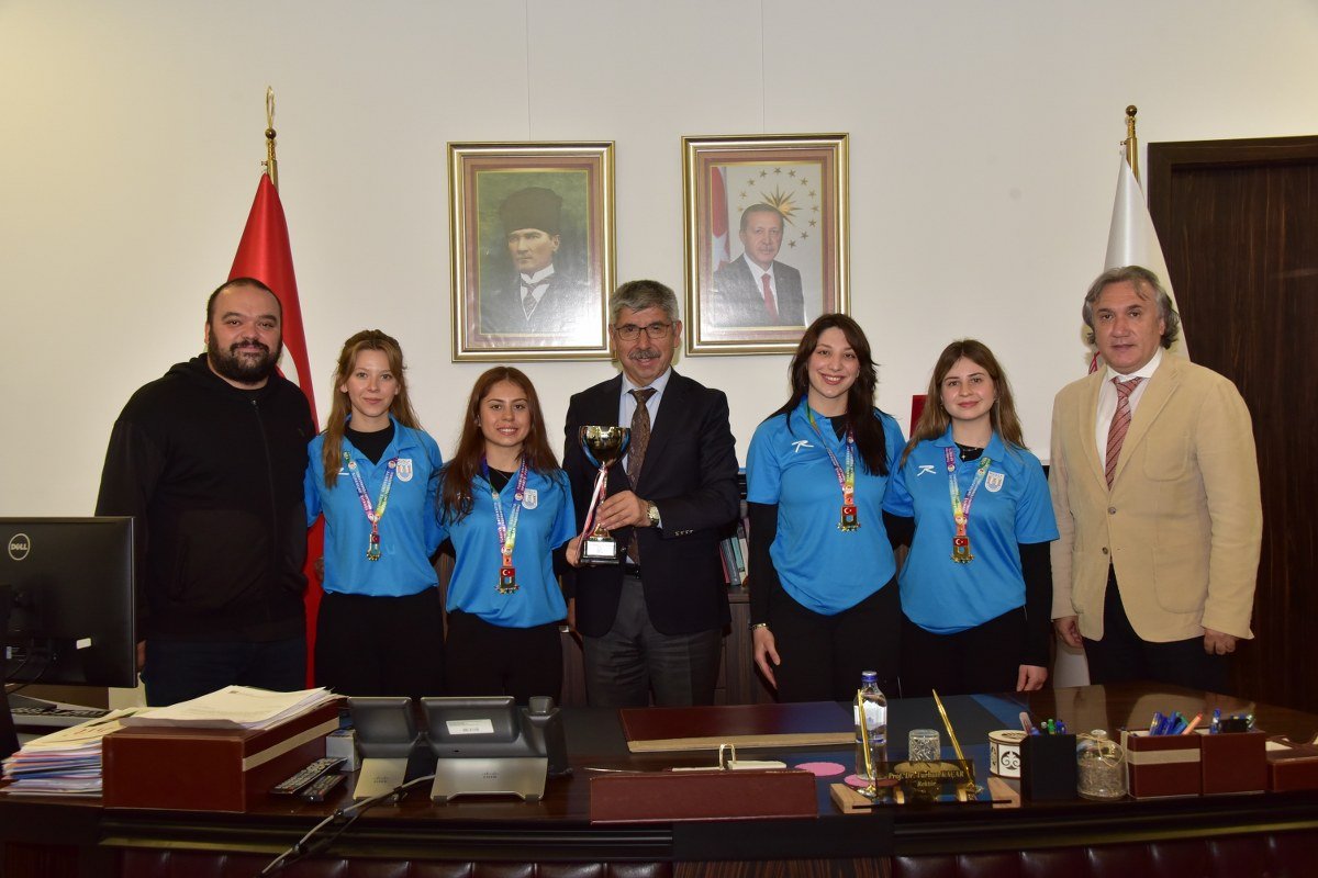 Rektörlük makamında gerçekleşen ziyarette, şampiyon takım sporcuları Hazal Burun, Ceyda Kömür, Gülçin Balık, Meltem Yaka ve Songül Lök kupa ve madalyalarıyla birlikte hazır bulundu. Sporculara, Spor Bilimleri Fakültesi Dekanı Prof. Dr. Özcan Saygın ile takım antrenörü Arş. Gör. Kaan Salman da eşlik etti.