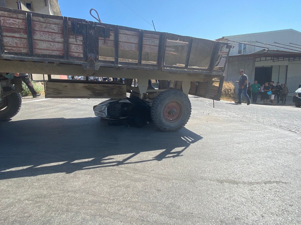 Traktörle çarpışıp römorkun altında kalan motosikletin sürücüsü ölümden döndü
