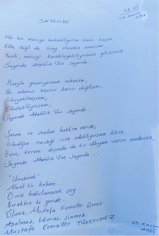 Fethiye Halk Eğitim Merkezi’nde 10 Kasım Atatürk'ü Anma Günü nedeniyle yapılan programına katılım yoğun oldu. Programda; İngilizce öğretmeni Saadet Ünsal Demir’in yazıp okuduğu “Sayende” şiiri duygulandırdı.