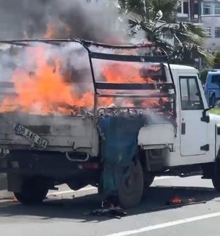 Seyir halindeki karton yüklü kamyonetin kasasında bulunan kartonlar alev aldı. Olayda ölen ya da yaralanan olmazken, araçta maddi hasar meydana geldi.