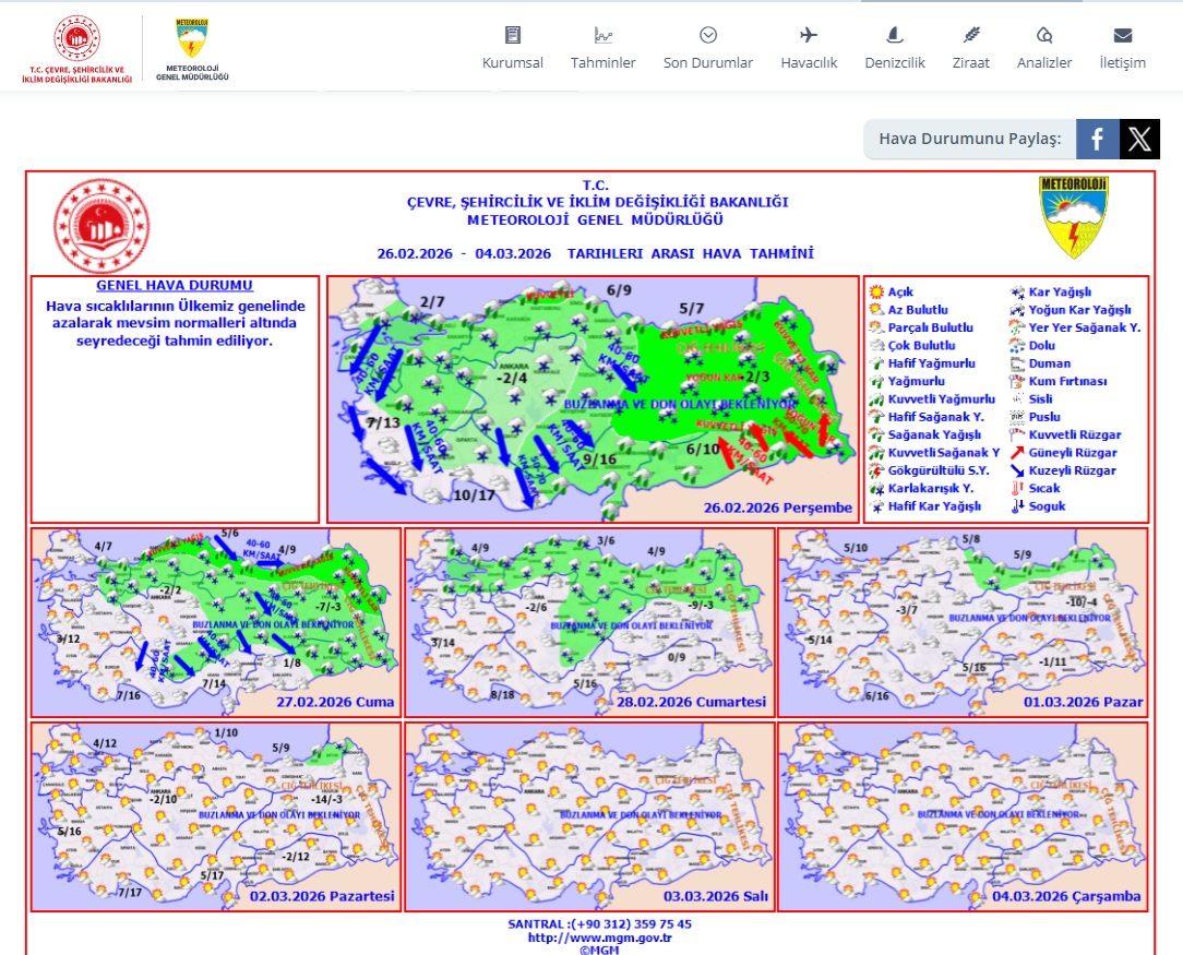 Meteoroloji Genel Müdürlüğü olarak yapılan değerlendirmelere göre: Ülkemiz genelinin parçalı ve çok bulutlu, Ege kıyıları ile Antalya çevreleri dışında aralıklı yağışlı geçeceği tahmin ediliyor. Yağışların, Doğu Akdeniz, Karadeniz kıyıları, Güneydoğu Anadolu ile Kocaeli, Yalova, Sakarya, Manisa ve Denizli çevrelerinde yağmur ve sağanak, yağış alan diğer yerlerde karla karışık yağmur ve kar şeklinde olması bekleniyor. Yağışların, Doğu Akdeniz, Doğu Karadeniz, Doğu Anadolu, Sivas, Kayseri, Ordu, Tokat, Gaziantep, Kilis, Adıyaman, Diyarbakır ve Siirt çevreleri ile Kastamonu'nun kıyı kesimlerinde yer yer kuvvetli olacağı tahmin ediliyor. Gece ve sabah saatlerinde iç ve doğu bölgelerde buzlanma ve don olayı bekleniyor. Doğu Karadeniz’in iç kesimlerinin yüksekleri ile Doğu Anadolu’nun doğusunda yüksek kar örtüsüne sahip eğimli kesimlerinde çığ tehlikesi ile kar erimesi tehlikesi bulunmaktadır.