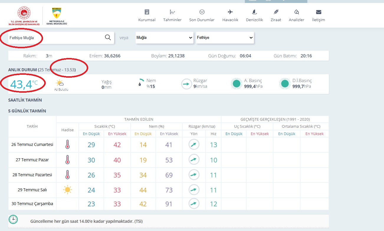 Meteoroloji Genel Müdürlüğü verilerinden alınan bilgiye göre Fethiye’de saat 13.50 sıralarında hava sıcaklığı gölgede 43.4 olarak kaydedildi. Nem ise % 15 olarak ölçüldü.