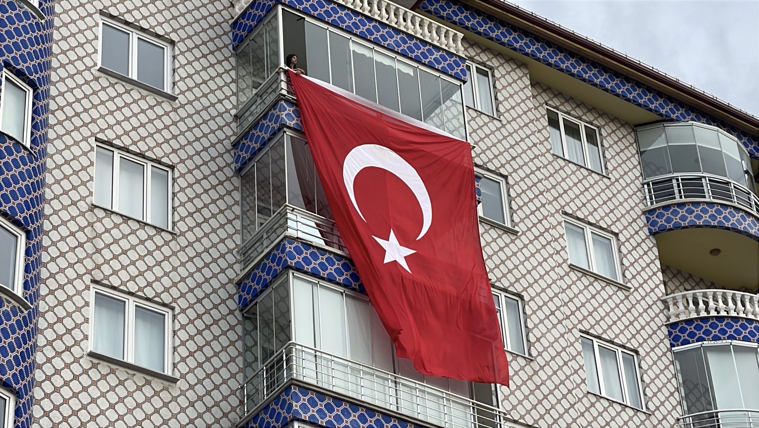 Ankara'nın Haymana ilçesinde aranan bir şahsı takip ederken geçirdiği kaza sonucu şehit olan Jandarma Astsubay Emre Polat'ın baba evine Türk bayrağı asıldı