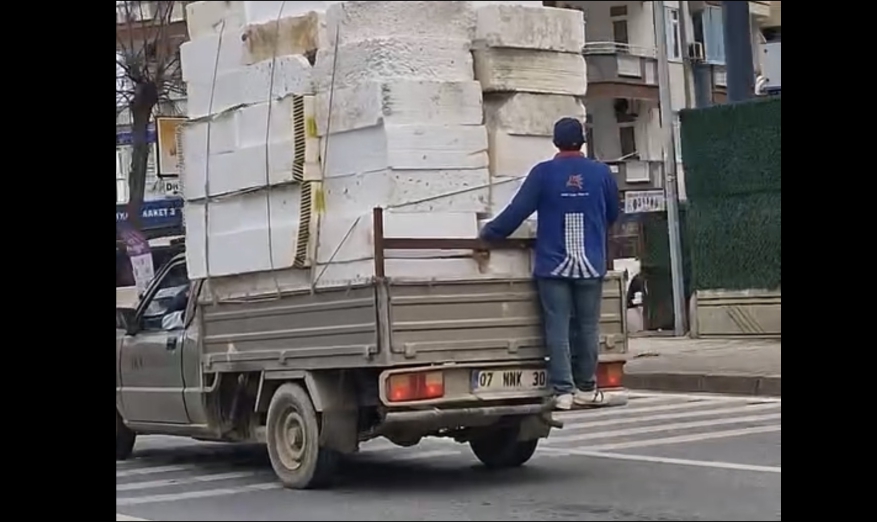 Görüntülerde inşaat malzemesi yüklü bir kamyonetin arkasında bir kişinin tutunarak ayakta seyahat ettiği dikkati çekti. Bir süre bu şekilde ilerleyen kamyonet, daha sonra gözlerden kayboldu.