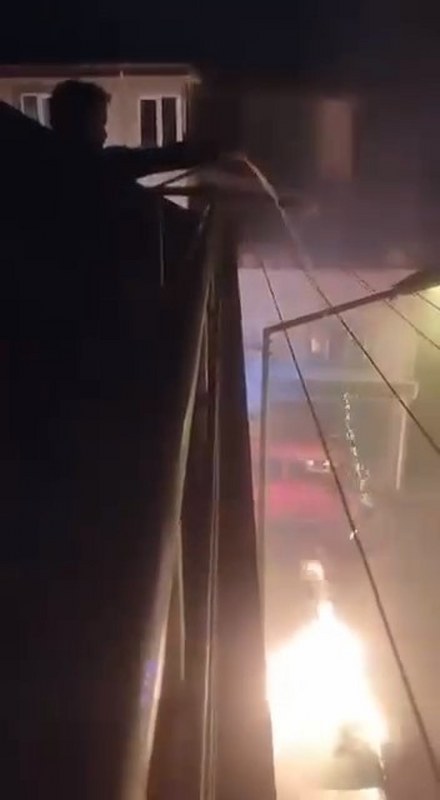 Bursa'nın Osmangazi ilçesinde eski model araç alev alev yandı. Balkonda olan bir vatandaş ise aracın üzerine pet şişeyle su döktü. O anlar kameraya anbean yansıdı.