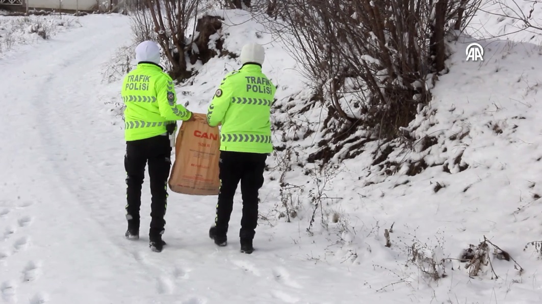 Sivas'ın Zara ilçesinde trafik polisleri, ilçede etkili olan soğuk hava ve kar yağışının ardından yaban hayvanları için doğaya yem bıraktı.