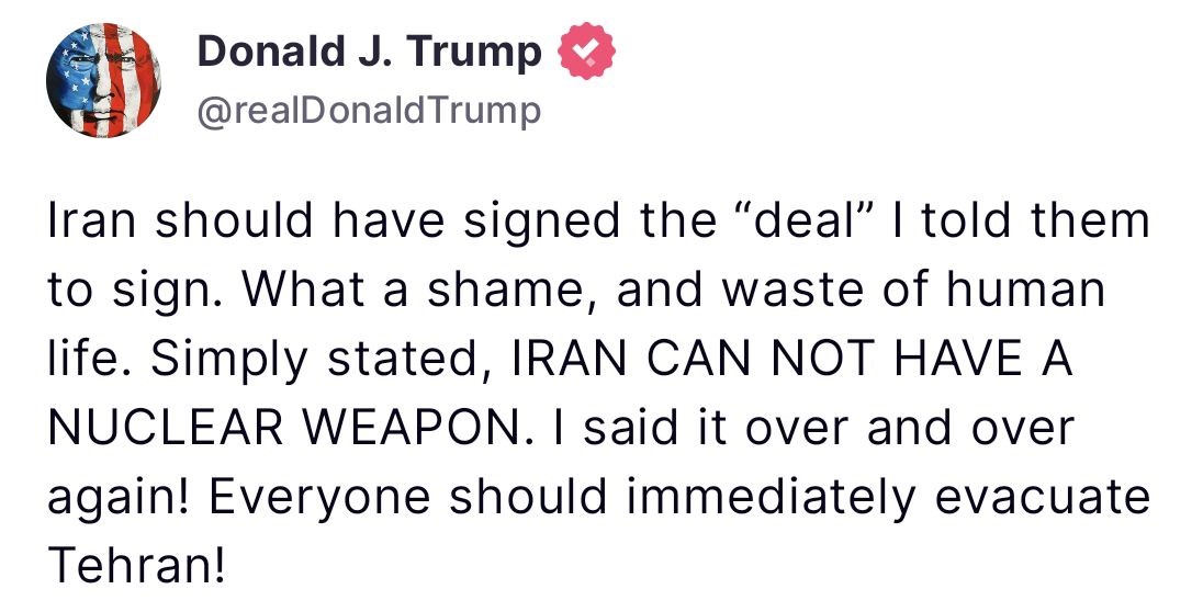 ABD Başkanı Donald Trump, kendisine ait Truth Social adlı sosyal paylaşım sitesi üzerinden bir açıklama yayınlayarak İran’ın başkenti Tahran’ın tahliye edilmesi çağrısında bulundu. Açıklamasında Trump, "İran’ın anlaşmaya imza atması gerekiyordu. Onlara imzalamalarını söyledim. Çok yazık oldu ve birçok insan kaybedildi. Açıkça söyledim, İran nükleer silah sahibi olamaz. Bunu defalarca söyledim! Herkes, Tahran’ı acilen tahliye etmeli" diye yazdı.