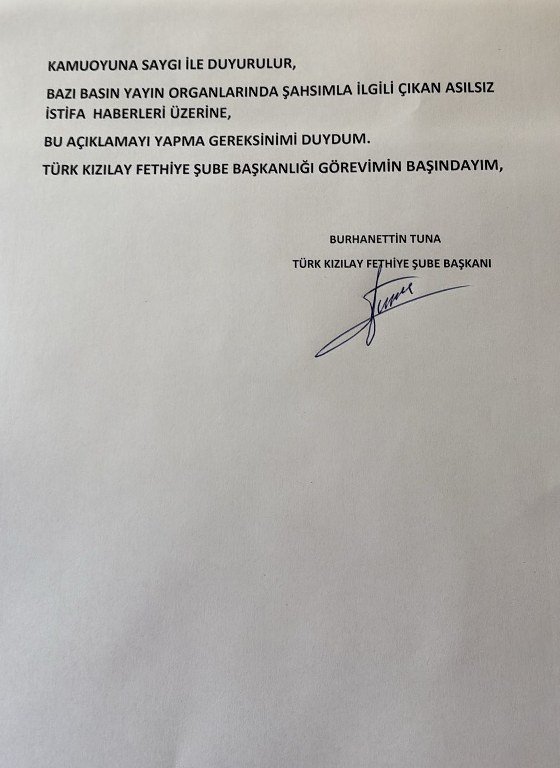 Kızılay Fethiye Şubesi Başkanı Burhanettin Tuna, istifa etmediğini, görevinin başında olduğunu belirtti.