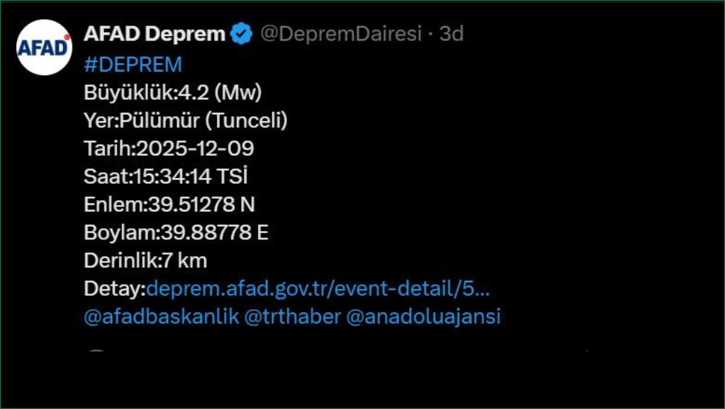 Afet ve Acil Durum Yönetimi Başkanlığı Deprem Dairesi Başkanlığından alınan bilgiye göre, saat 15.34’de merkez üssü Tunceli’nin Pülümür ilçesinde 4.2 büyüklüğünde deprem meydana geldi. Yerin yaklaşık 7 kilometre derinliğinde meydana gelen depremle ilgili olumsuz bir durum yaşanmadığı öğrenildi. (İHA) -