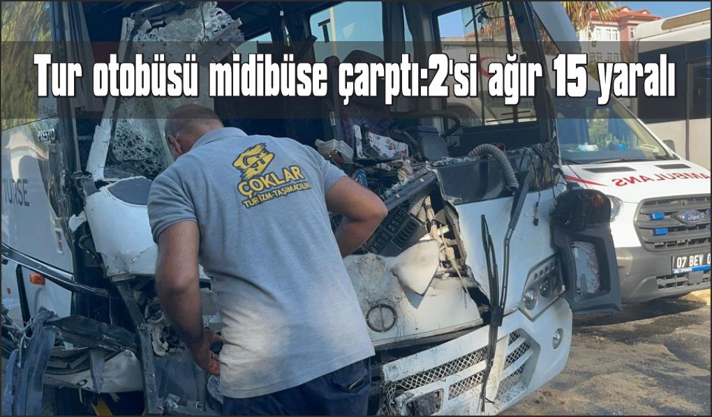 Antalya’nın Alanya ilçesinde özel tur otobüsüyle yolcu midibüsünün çarpışması sonucu ilk belirlemelere göre 2’si ağır 15 kişi yaralandı