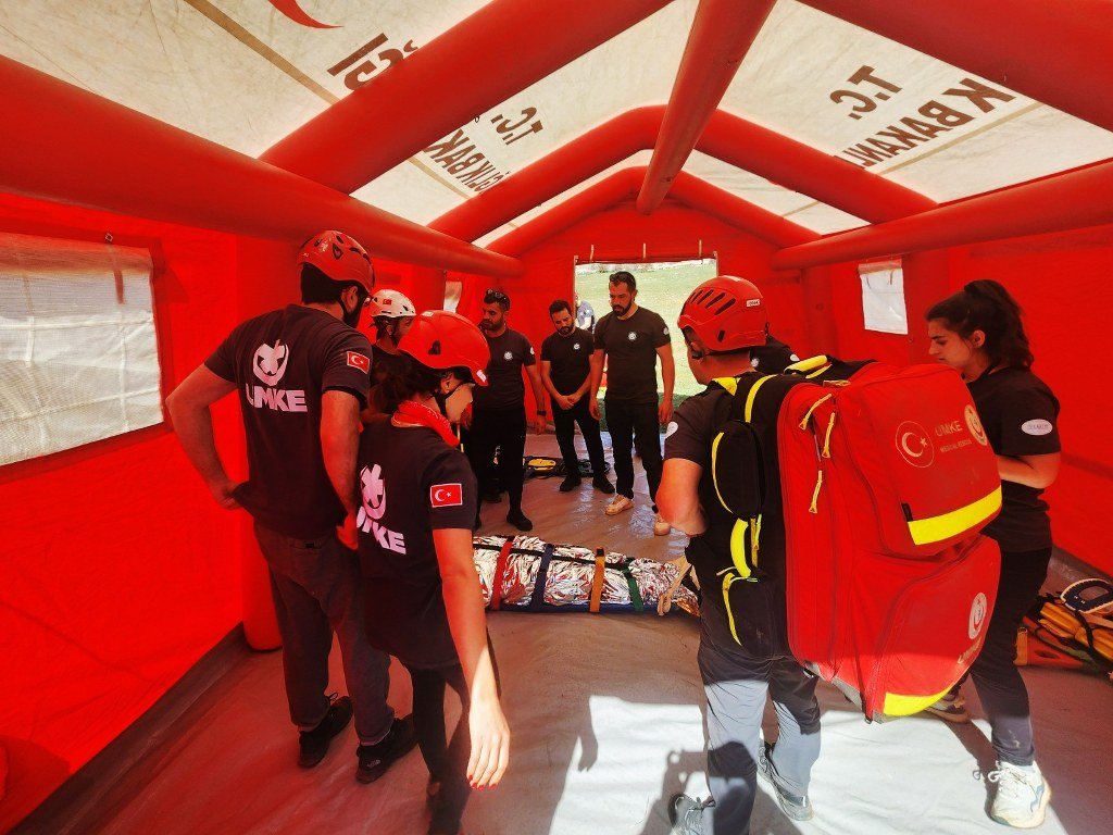 Muğla’da UMKE ekipleri tarafından yapılan tatbikat gerçeği aratmadı, Ekipler tatbikat gereği patlama yaşanan bir binada mahsur kalan yaralıları nefes kesen bir operasyonla kurtararak hastaneye naklettikleri anlar gerçeği aratmadı. Muğla’nın Menteşe ilçesine bağlı Yılanlı Yaylasında 2 gündür devam eden tatbikata katılan 2’si doktor 24 sağlık çalışanı zorlu şartlarda eğitiliyorlar. Gece kamp alanına kurdukları çadırlarda kalan personel zaman zaman -10 dereceye rağmen düşen hava sıcaklığına rağmen göreve devam ediyor. Muğla’da UMKE ekipleri tarafından yapılan tatbikat gerçeği aratmadı, Ekipler tatbikat gereği patlama yaşanan bir binada mahsur kalan yaralıları nefes kesen bir operasyonla kurtararak hastaneye nakillerini sağladı.