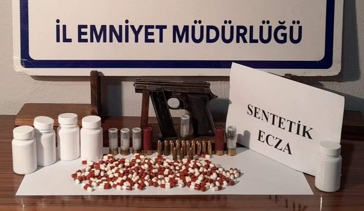 Gönen İlçe Emniyet Müdürlüğü ekiplerince yapılan çalışmalar çerçevesinde G.Ö. isimli şahsa ait ikamette arama gerçekleştirildi. Edinilen bilgiye göre, gecikmesinde sakınca bulunan hâl kapsamında yapılan aramada; 1 adet Browning ibareli tabanca, 919 mm çapında dolu tabanca fişeği, 7 adet dolu av fişeği kartuşu ile 5 kutu içerisinde toplam 240 adet sentetik ecza maddesi ele geçirildi.