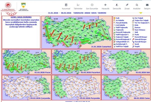 Balkanlar ve Orta Akdeniz üzerinden gelen yağışlı hava sistemin 3 Şubat Salı gününe kadar devam edecek. Salı havanın açmasıyla sıcaklık düşecek. 5 Şubat Perşembe batıdan gelecek yeni bir yağışlı hava etkisini göstermeye başlayacak.