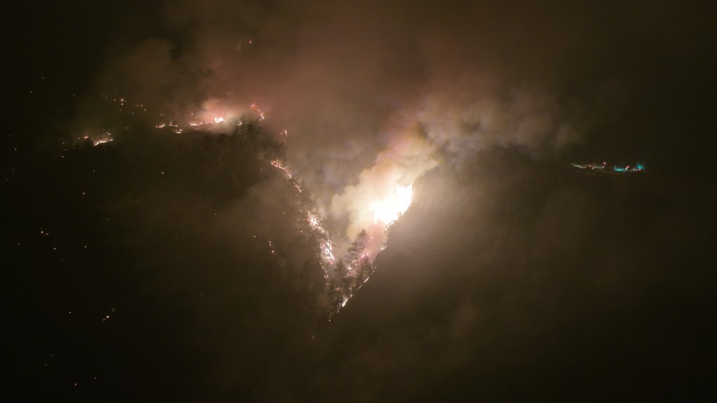 Yangın bölgesinde parçalar halinde devam eden alevler, gece saatlerinde dron ile havadan görüntülendi. Görüntülerde, yangın noktalarına ekiplerin karadan müdahaleleri zorlu arazi şartlarına rağmen devam ediyor. (İHA)