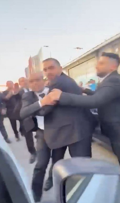 Caddeyi kullanmak isteyen bir sürücü ve eşi, duruma tepki gösterince ise konvoydaki bazı şahıslar araca taş ve yumrukla saldırdı. Yaşanan o anlar ise kameraya yansıdı.