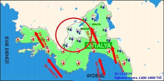 Yağışlar; bölge genelinde kuvvetli, sahil kesimlerde çok kuvvetli, Muğla'nın Ula, Marmaris, Köyceğiz, Dalaman, Ortaca, Fethiye ve Seydikemer ilçelerinde, Antalya'nın Kaş, Demre, Finike, Kumluca, Aksu, Serik, Manavgat ve Alanya ilçelerinde şiddetli, yer yer aşırı olması bekleniyor.