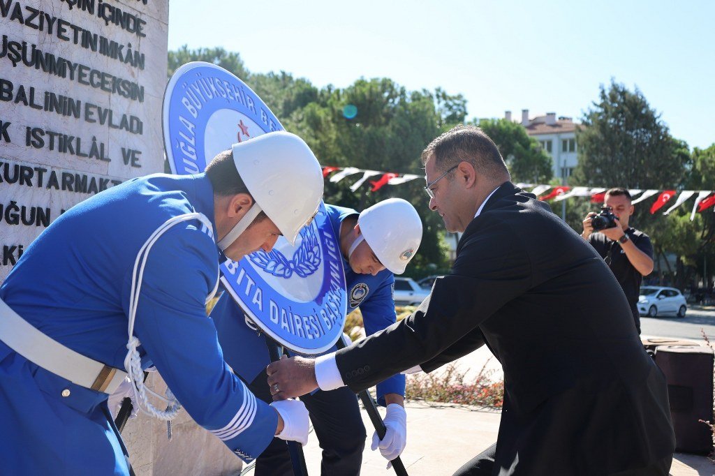 Kutlama etkinlikleri kapsamında ilk olarak Cumhuriyet Meydanı’nda çelenk koyma töreni gerçekleştirildi. Törene Muğla Büyükşehir Belediyesi Genel Sekreteri Tayfun Yılmaz, daire başkanları, zabıta amirleri ve zabıta personeli katıldı. Saygı duruşu ve İstiklal Marşı’nın okunmasının ardından Atatürk Anıtı’na çelenk sunuldu.