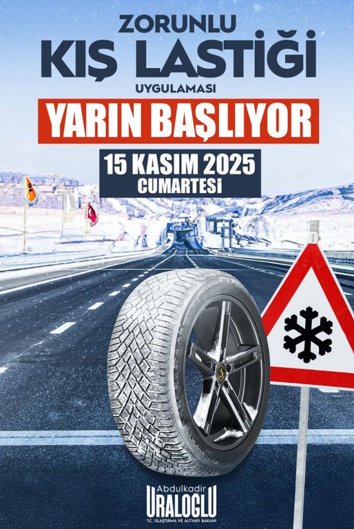 Bakan Uraloğlu, zorunlu kış lastiği uygulamasının 15 Kasım’da başlayacağını hatırlatarak “1 Aralık’ta başlayıp 1 Nisan’da sona eren zorunluluğu, mevsimsel şartlar gereği 15 Kasım–15 Nisan tarihleri olarak güncellemiştik. Böylece zorunlu kış lastiği uygulama süresini 4 aydan 5 aya çıkardık.” ifadelerini kullandı.