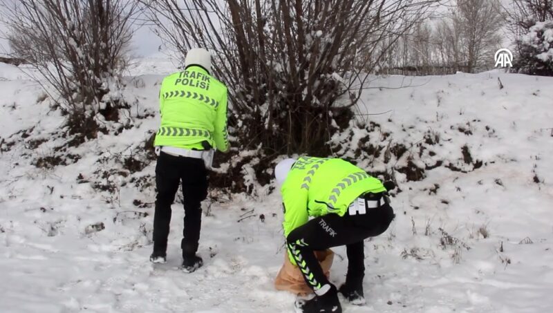Sivas’ın Zara ilçesinde trafik polisleri, ilçede etkili olan soğuk hava ve kar yağışının ardından yaban hayvanları için doğaya yem bıraktı.